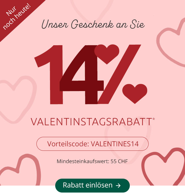 *Ihr 14 % Rabatt ist nur einmalig gültig ab 55 CHF Mindesteinkaufswert bei einer Bestellung bis zum 15.02.2025. Keine Barauszahlung. Die Aktion ist nicht übertragbar und kann nicht in Verbindung mit anderen Aktionen oder bei Kooperationspartnern eingelöst werden. Die Vorteilsnummer muss bei der Bestellung angegeben werden. Bei Unterschreitung des Mindesteinkaufswertes durch Widerruf behalten wir uns das Recht vor, den Rabatt zu stornieren. Der Wert von nicht zurückgesendeten Waren ist in diesem Fall in voller Höhe zu bezahlen. Der Rabatt kann nicht auf bereits getätigte Bestellungen gewährt werden. Geschenk-Gutscheine, Bücher und Zeitschriften sind von der Aktion ausgenommen.