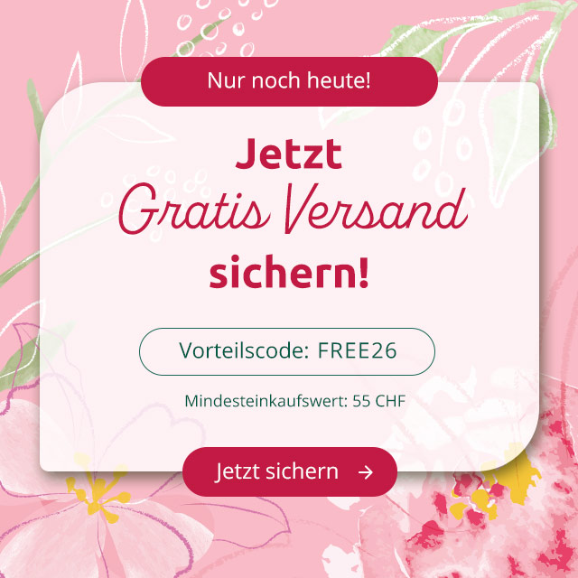 *Sie erhalten die Gutschrift der Versandkosten ab einem Mindesteinkaufswert von 55 CHF einmalig bei einer Bestellung bis zum 23.04.2026. Frachtkosten sind hiervon ausgenommen. Keine Barauszahlung. Die Aktion ist nicht übertragbar und kann nicht in Verbindung mit anderen Aktionen oder bei Kooperationspartnern eingelöst werden. Die Vorteilsnummer muss bei der Bestellung angegeben werden. Die Gutschrift kann nicht auf bereits getätigte Bestellungen gewährt werden. |