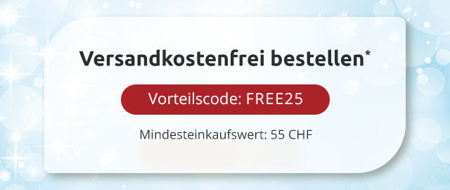 *Sie erhalten die Gutschrift der Versandkosten ab einem Mindesteinkaufswert von 55 CHF einmalig bei einer Bestellung bis zum 27.11.2025. Frachtkosten sind hiervon ausgenommen. Keine Barauszahlung. Die Aktion ist nicht übertragbar und kann nicht in Verbindung mit anderen Aktionen oder bei Kooperationspartnern eingelöst werden. Die Vorteilsnummer muss bei der Bestellung angegeben werden. Die Gutschrift kann nicht auf bereits getätigte Bestellungen gewährt werden. |