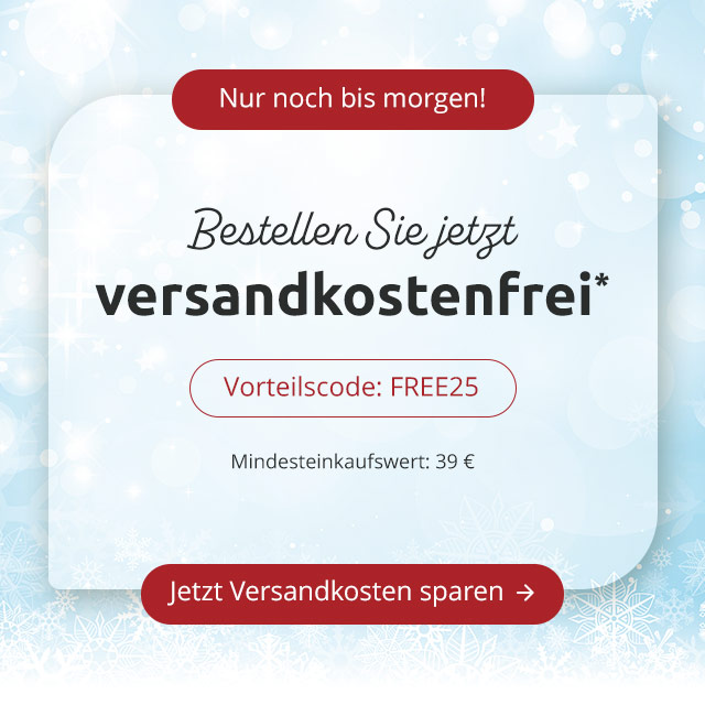 *Sie erhalten die Gutschrift der Versandkosten ab einem Mindesteinkaufswert von 55 CHF einmalig bei einer Bestellung bis zum 27.11.2025. Frachtkosten sind hiervon ausgenommen. Keine Barauszahlung. Die Aktion ist nicht übertragbar und kann nicht in Verbindung mit anderen Aktionen oder bei Kooperationspartnern eingelöst werden. Die Vorteilsnummer muss bei der Bestellung angegeben werden. Die Gutschrift kann nicht auf bereits getätigte Bestellungen gewährt werden.